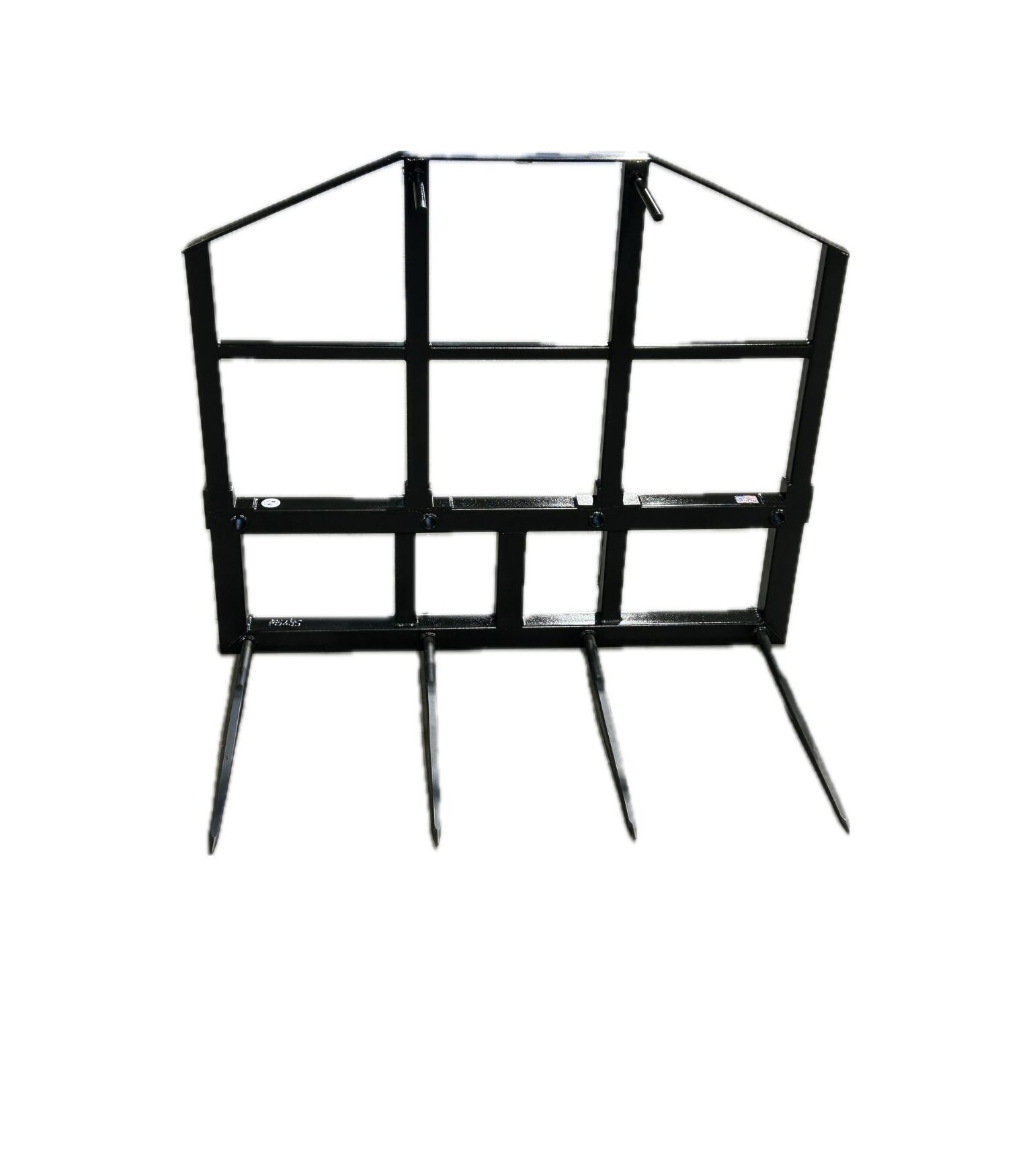 The Super Round-Up bale handler is 6’ tall and 7’ wide to carry up to three round bales (stacked) or three square bales (stacked). There are a total of eight spear receivers set in the 4” x 3/16” square tubing frame, allowing for a completely customizable spear setup. This unit comes with two bale stabilizers.